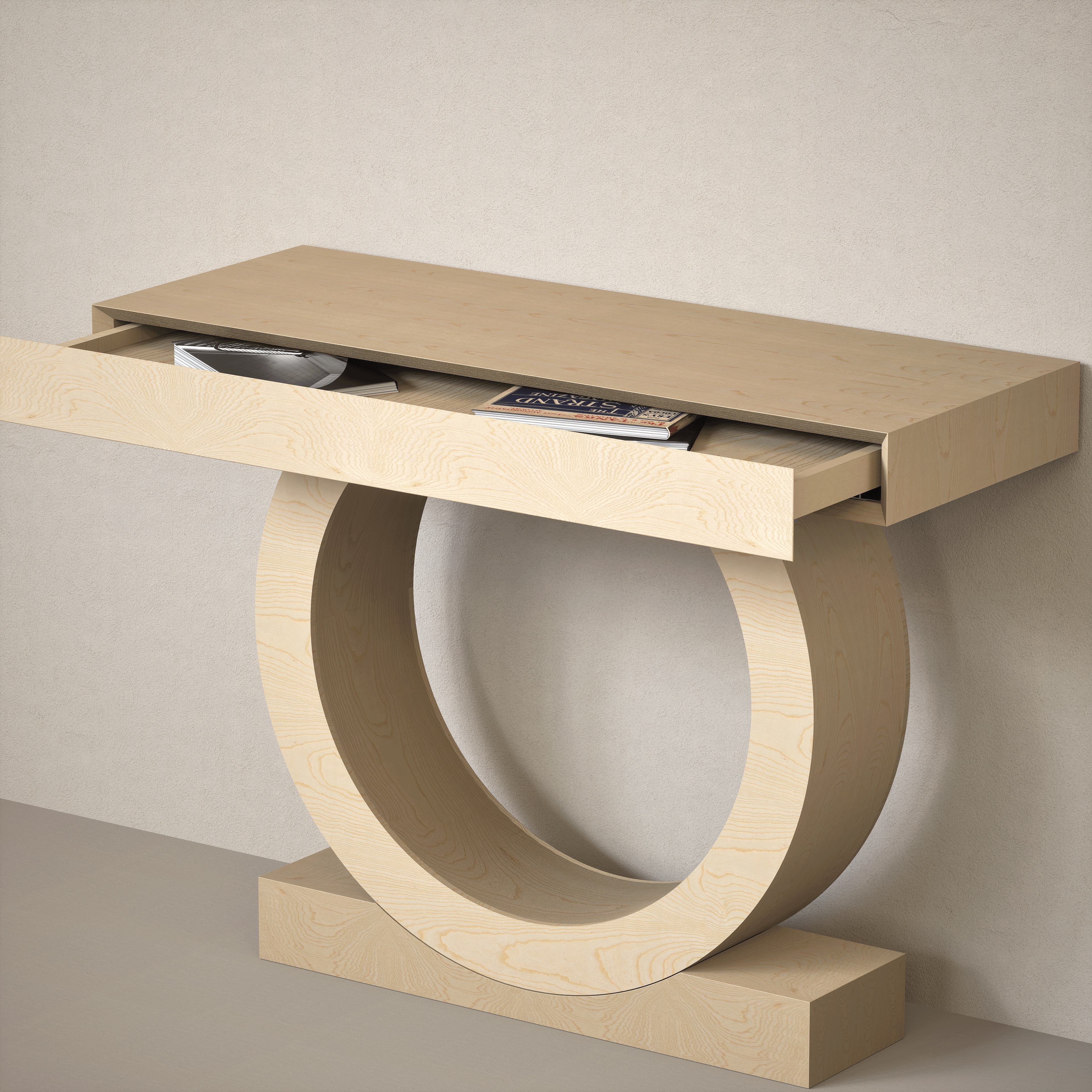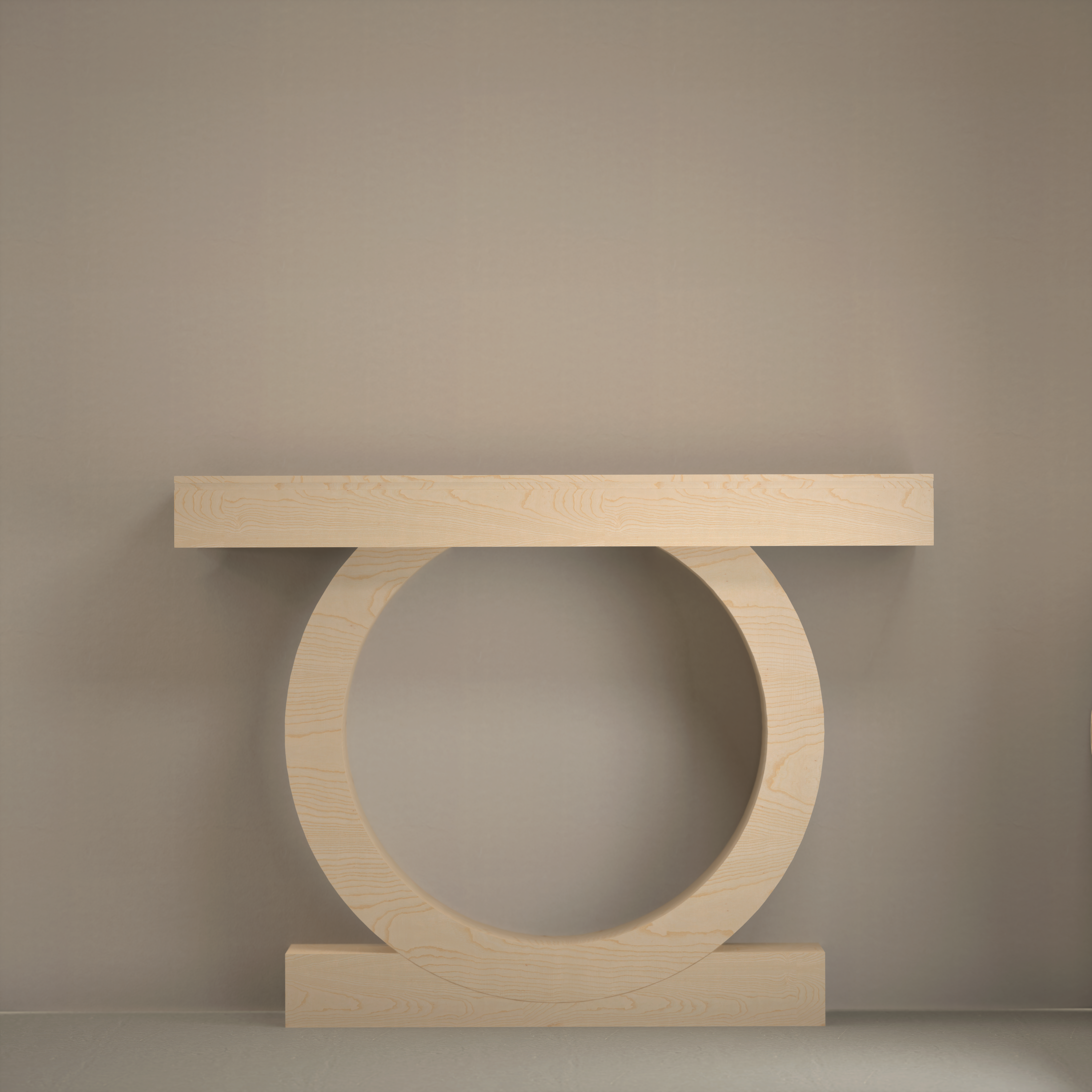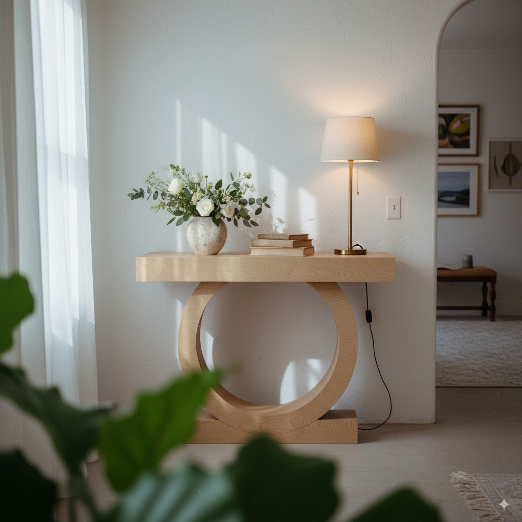 Konsola Kanso to czysta, spokojna forma z mocnym architektonicznym znakiem – szeroki, prosty blat wsparty na łagodnym, ciągłym łuku kolistej nogi. To nie konstrukcja, która ma dużo mówić. To konstrukcja, która wie, gdzie stać.