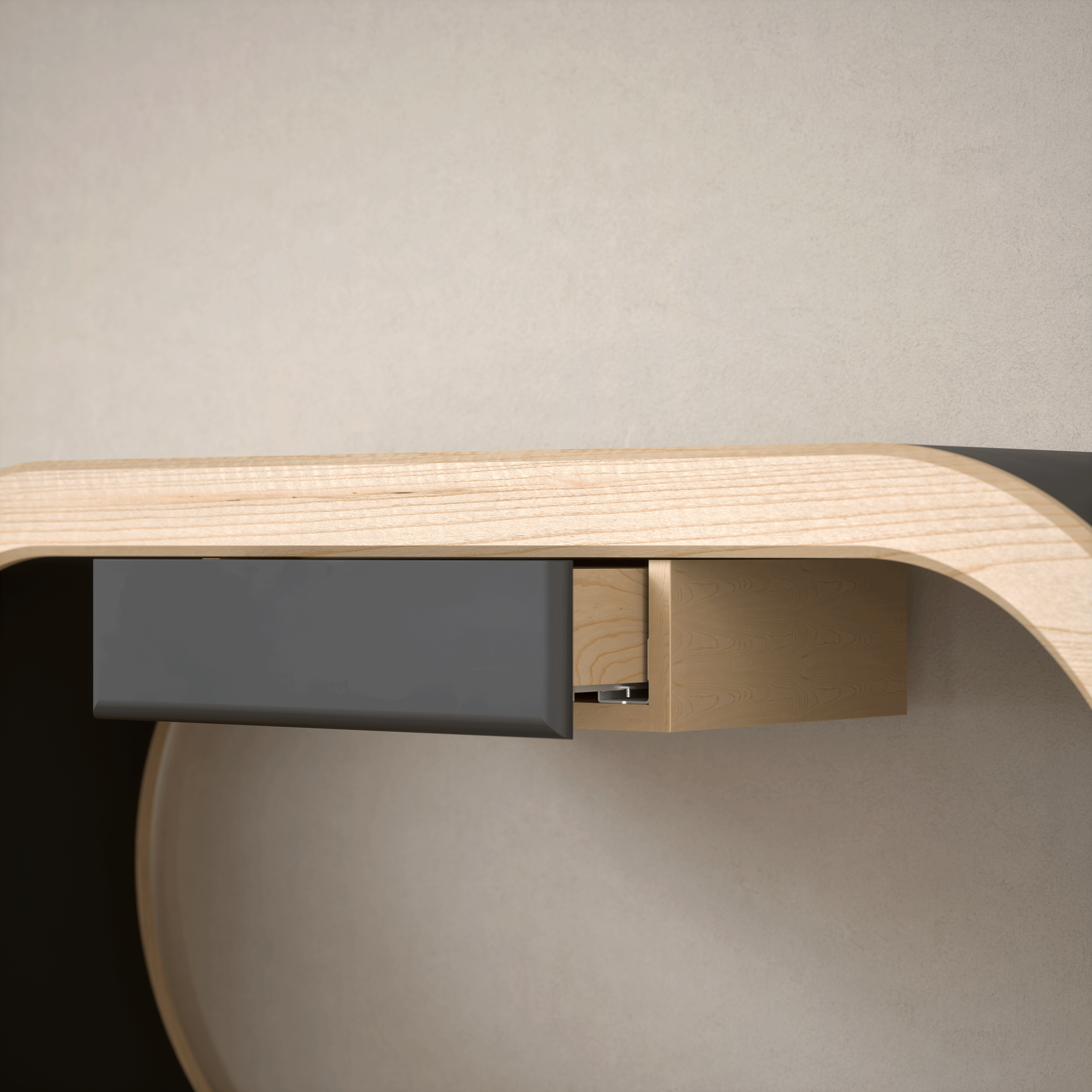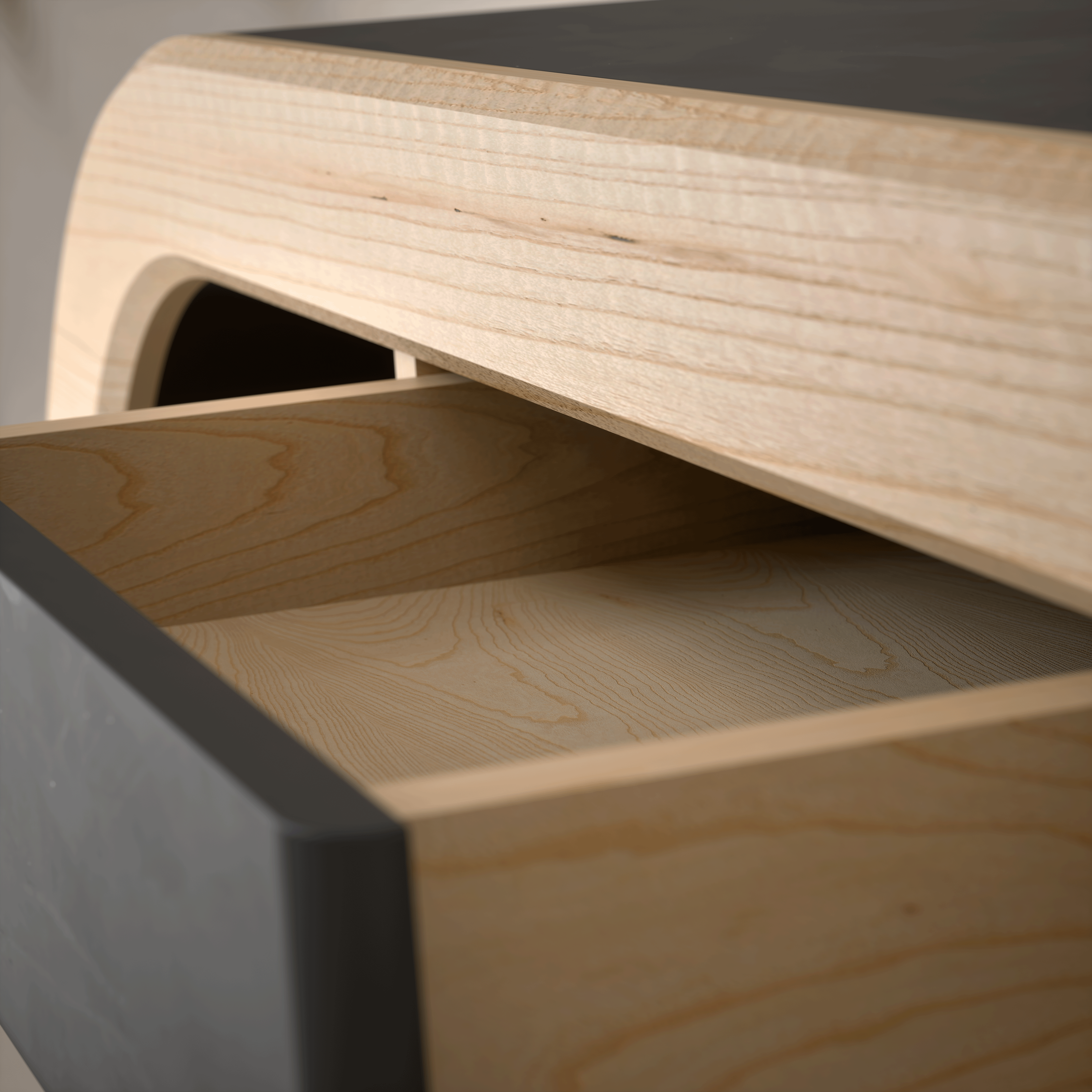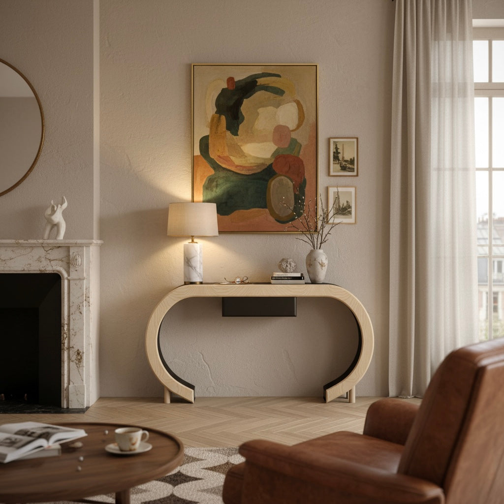 Konsola Elisse to łuk, który nie domaga się uwagi – a i tak ją dostaje. Blat opiera się na eliptycznym rysie nóg, których linie prowadzą oko płynnie, bez pośpiechu, jak szkic zamknięty w idealnej krzywej.