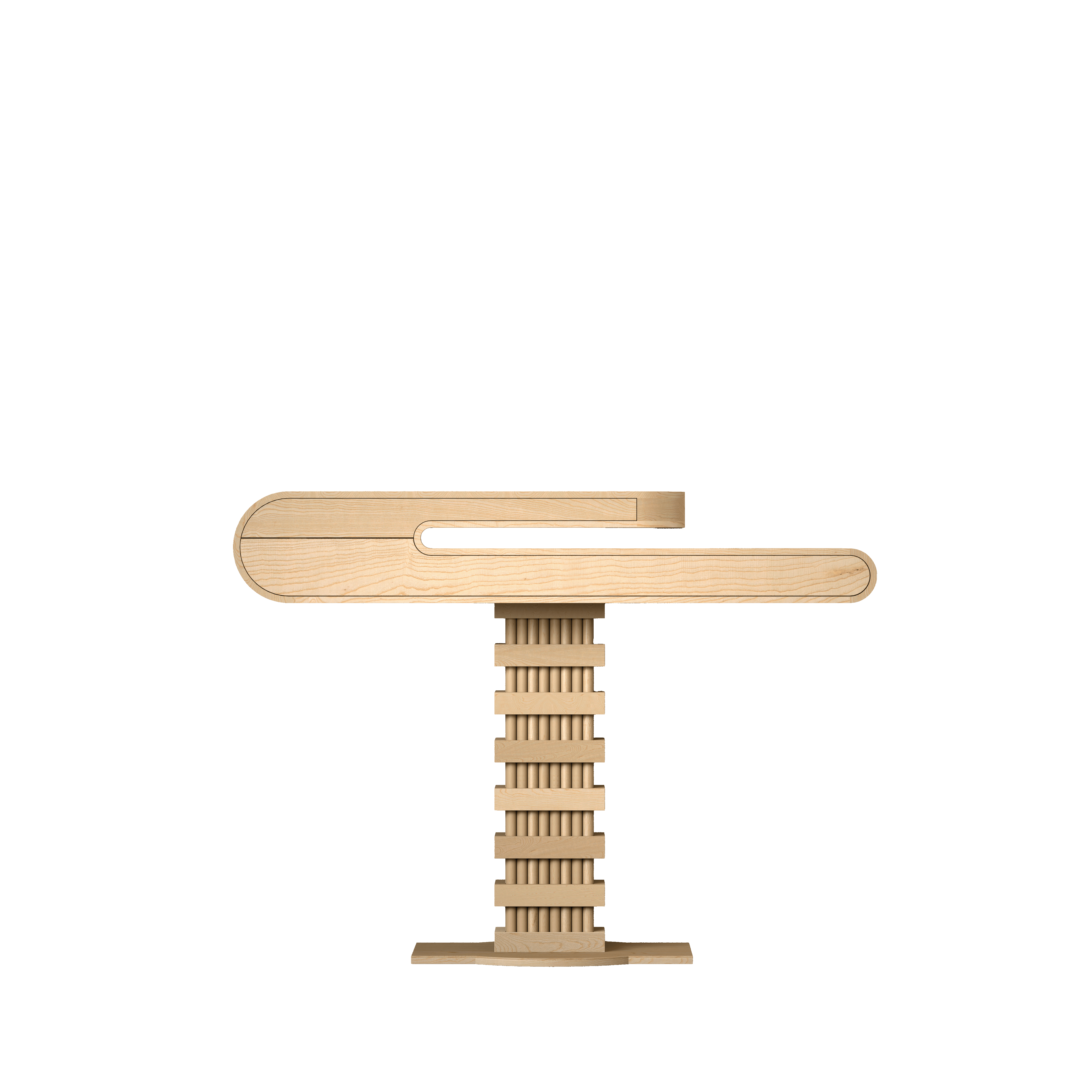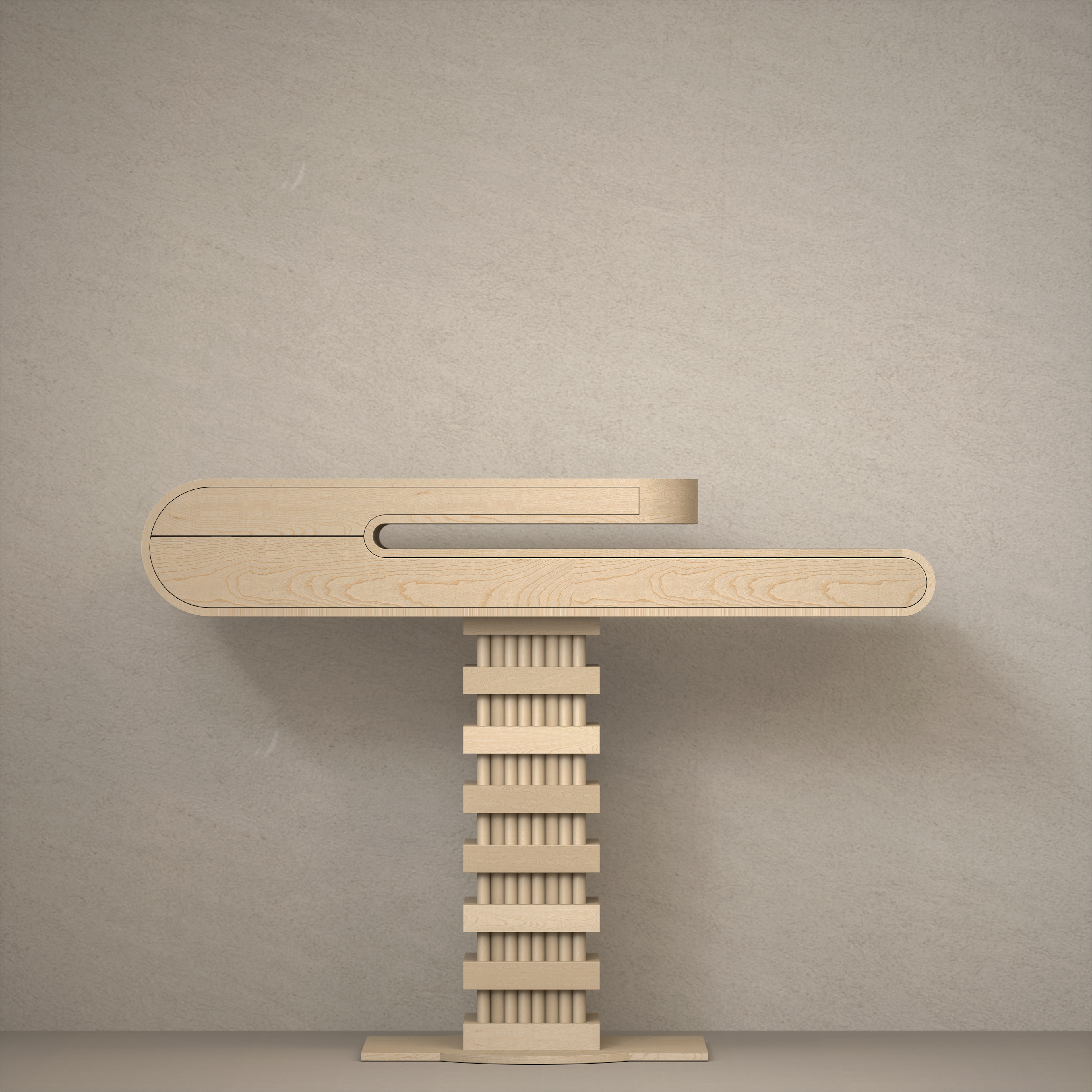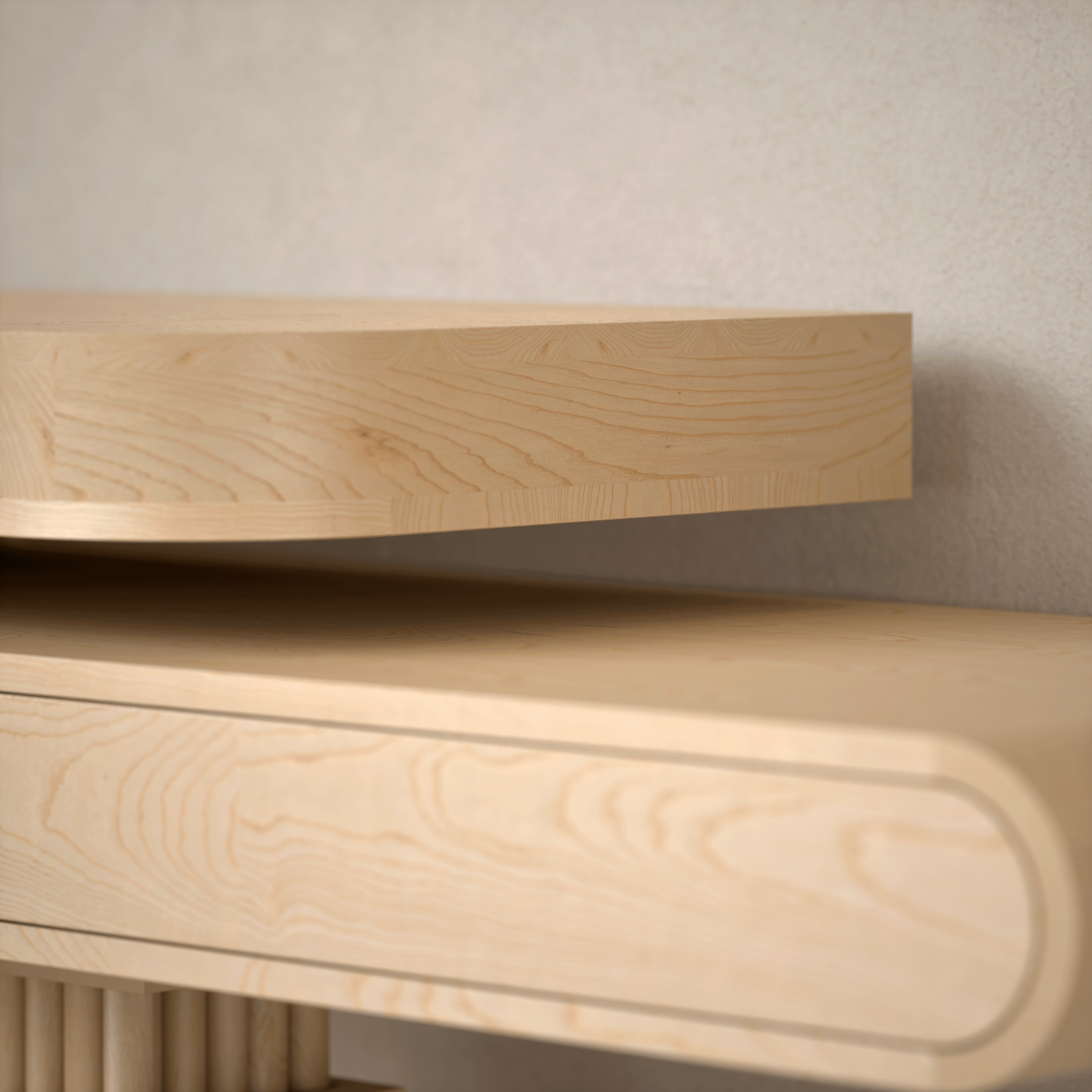 Konsola Echo Form to odważna gra kontrastów masy. Górna część – lekko wydłużona i miękko prowadzona – stoi w wyraźnym dialogu z bryłą podstawy. Jedna jest gestem ruchu, druga – ciężarem formy.